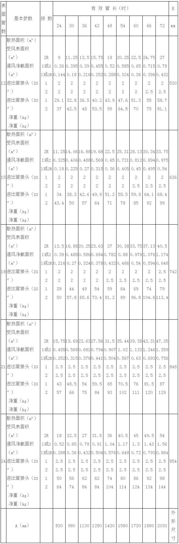 表中基本參數數據域不同排數,不同片距型空氣熱交換器換算式