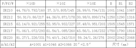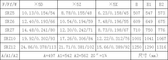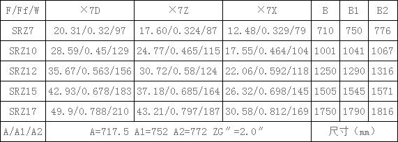 表4、SRZ空氣熱交換器(散熱器)散熱面積F(m2),通風凈截面積Ff(m2),參考重量W(Kg),有關(guān)尺寸(mm)一覽表
