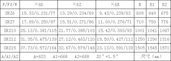 表6、SRZ空氣熱交換器(散熱器)散熱面積F(m2),通風凈截面積Ff(m2),參考重量W(Kg),有關(guān)尺寸(mm)一覽續(xù)表